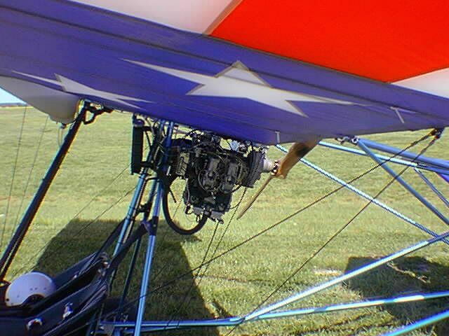 The engine mount is upside down, with a 582, dual carb, oil injection and a B box with a Tennessee prop. Performance is great due to the relative power to weight, no electric start and such.