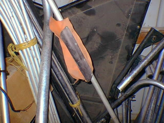 An interesting tube that showed up along with the complete trike was a used and abused landing gear downtube. The large gouge is from the driveshaft eating into the side of the tube after a crash landing. Note that this tube is severly bent along with the gouge. Often such a gouge will occur on a tube that is not bent or perhaps straightened for reuse as a result of other tube failures allowing contact between the shaft and tubing parts.