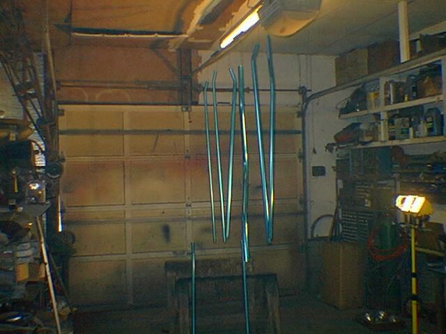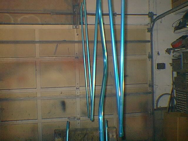 A customer of mine has mailed me some paint. It approximates the color and look of the anodized aluminum on a new MX. We have painted all the tubes to reassemble the trike portion of the MX. Here is a picture of the parts following cleaning and painting.